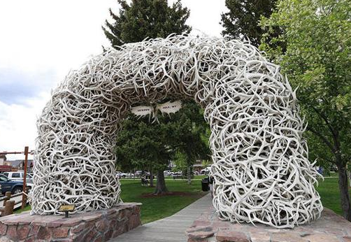 公园不大,在东西南北四个方向有用鹿角搭建成的巨型拱门。鹿角全是尖货,不过这些鹿角可不是捕杀所得,是每年冬天大批的麋鹿从山里来到杰克逊的“国家麋鹿保护区”过冬,春天鹿角自然脱落再更新,麋鹿走后,遍地留下无数的珍品。