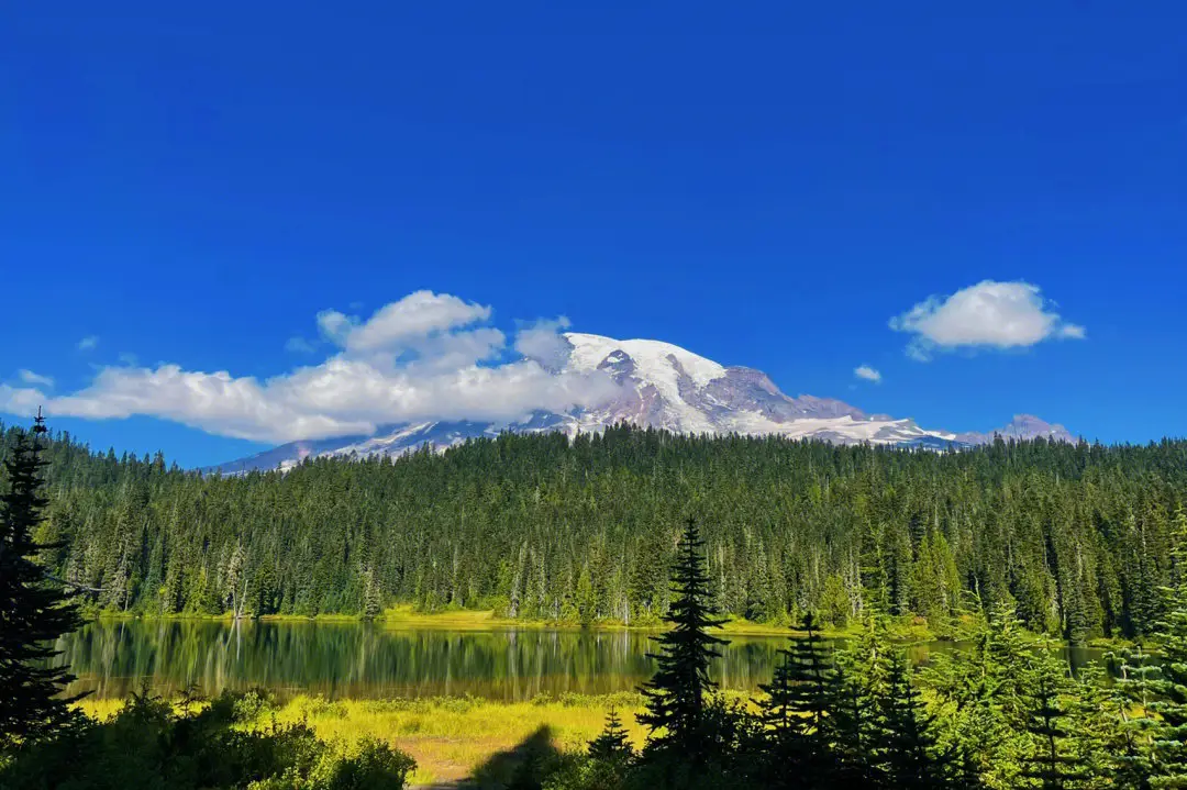 在西雅图晴朗的日子里,可以看到一座白雪皑皑的山仿佛漂浮在天际。这就是华盛顿州著名的雷尼尔火山。雷尼尔火山高14410尺,是美国本土48州中最高的火山,也是美国排名第五的高峰。山顶终年积雪,冰河向四方放射而出,造就了拥有壮观的瀑布,广浩的湖泊和苍翠欲滴的长青森林的雷尼尔国家公园。每年夏天,山顶上的积雪开始融化,高山上的野花齐开争艳,在风中摇曳,呈现出百分百的自然之美。