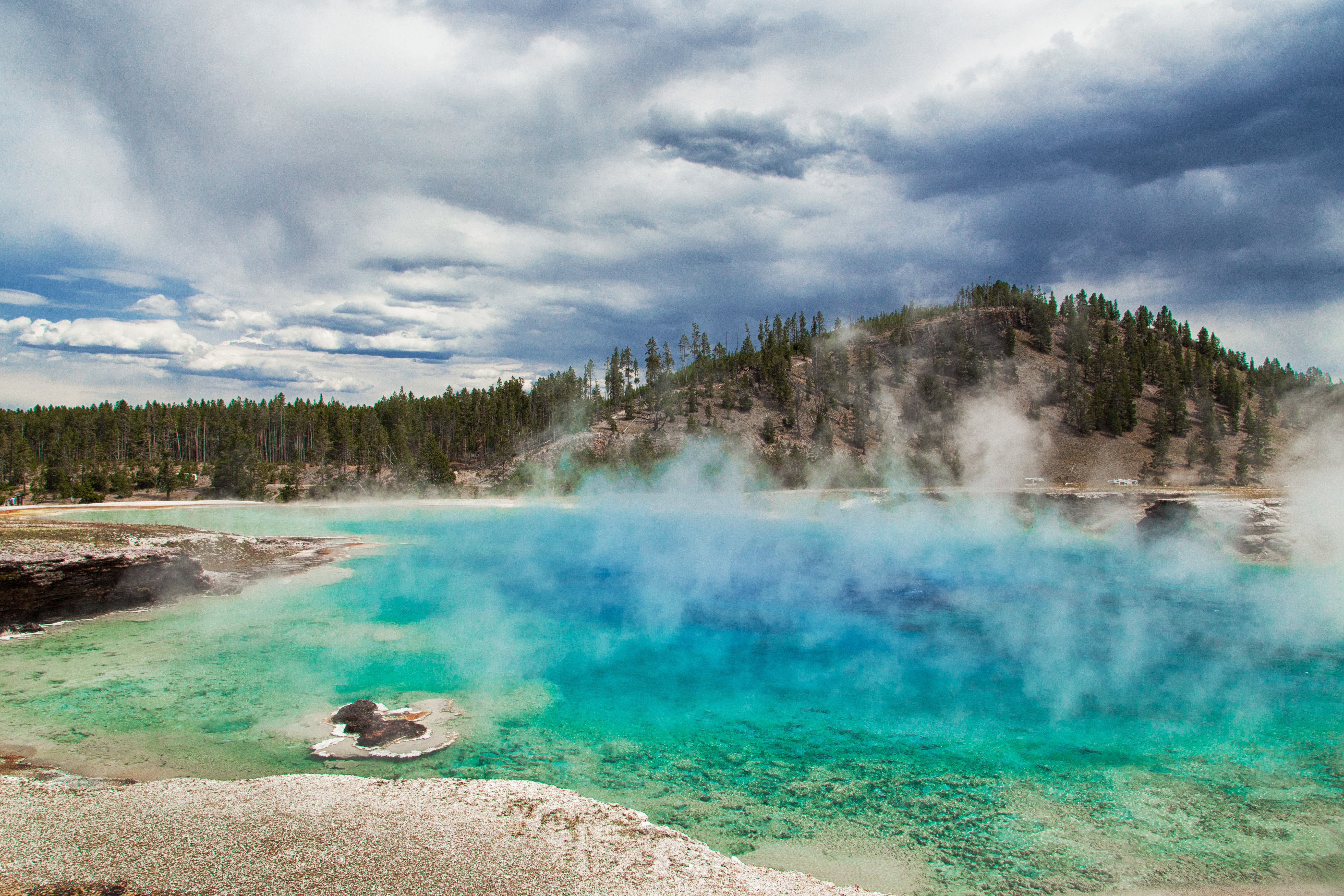游览不少于30分钟 西姆指间歇泉盆地,位于黄石湖边上,十五万年前因地壳陷落而形成,在热喷泉与湖水结合下,出现了一种烟雾弥漫的奇妙景观:烟雾缭绕处是热泉的蒸气,绿波盈盈处是黄石的湖水,与背景中蓝天白云相互辉映,形成与黄石其他温泉区不同的景观。此处相当于黄石湖的湖湾,许多间歇泉聚集此处,喷水口的颜色多种多样,有的呈透明绿色,有的呈好似水泥色般的暗暗的黑色。许许多多的喷水口呈现一种美丽的幻想。