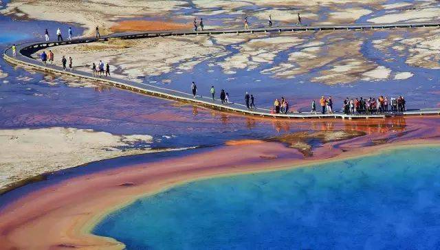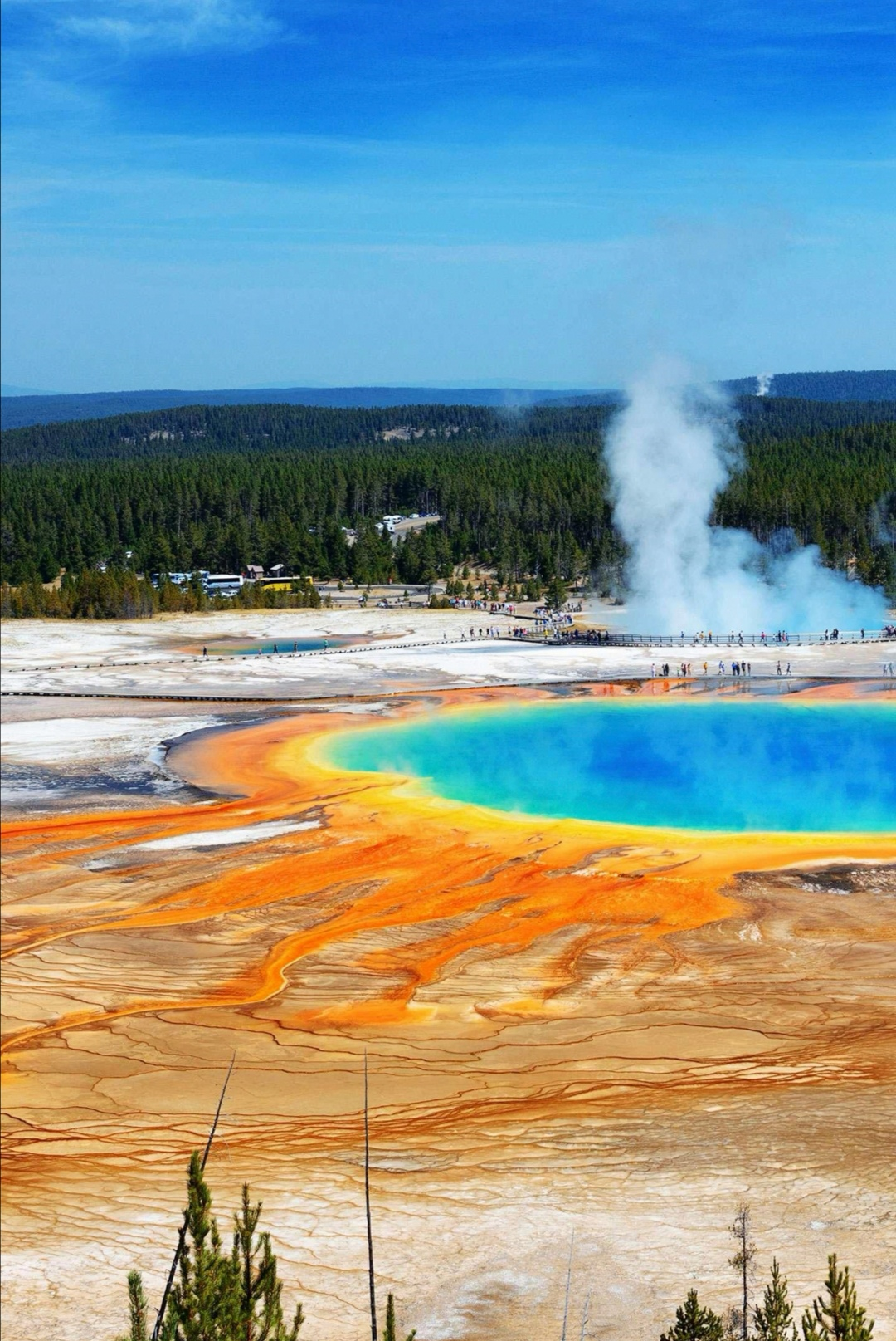 游览不少于75分钟 如天气及交通允许的情况下,我们保证100%近距离俯视【黄石之眼,大棱镜拍摄最美大片】 上帝一定是在打翻调色盘的时候,把色彩,泼到了这里,才有了“大棱镜泉”。这是黄石公园中的大温泉,又称大虹彩温泉,也被称为时“黄石之眼”,同时也是美国位居第一的温泉,世界第三大的温泉。大稜镜温泉的美在于湖面的颜色随季节而改变,在夏季,显现橙色、红色,或黄色。但到了冬季,水体呈现深绿色。在大棱镜的平面你可能看不到它的全部面貌,为了不让我们的旅行有遗憾,我们会开到距离观景台最近的停车场,沿着小道上到山上的观景台,俯瞰大棱镜泉的神秘面容。拍摄最美黄石之眼。