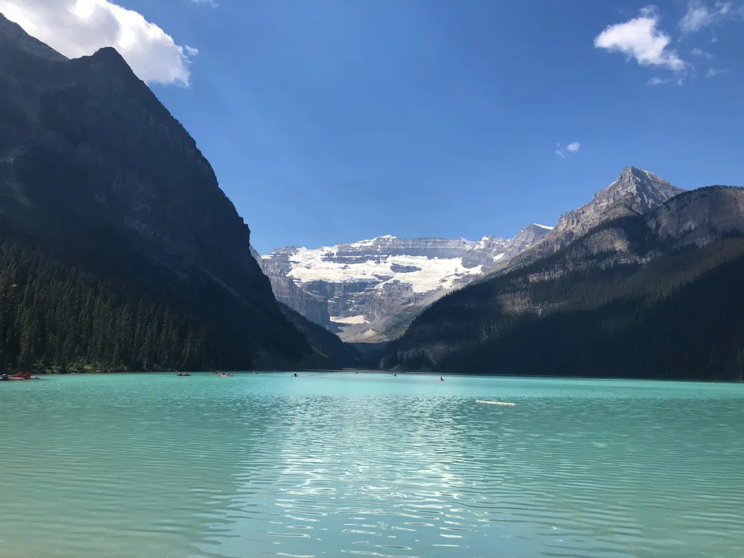 位于1号公路南侧的露易丝湖是班芙国家公园内一处著名景点,它以维多利亚山为屏障,在茂密森林的包围下,山水相依,形成一幅完美的风景照,露易丝湖就像一颗明珠,超尘脱俗,因此它被誉为“落基山脉上的蓝宝石”,成为摄影师们青睐的湖泊。