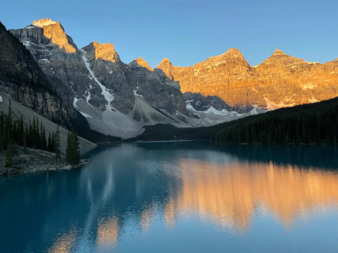 梦莲湖是加拿大班芙国家公园的一个冰川湖,坐落在著名的十峰谷中,湖底积满了富含矿物质的碎石,经年累月的沉积形成了变幻多姿的碧蓝色湖水,被公认为是世界上最有拍照价值的湖泊,湖面呈宝石蓝色,晶莹剔透,像是一颗璀璨的明珠。