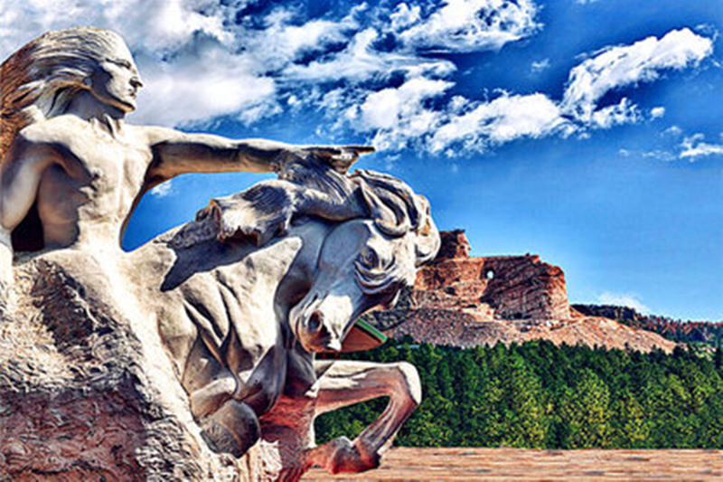 疯马山是为了纪念印第安的民族英雄、苏族的一位年轻的酋长疯马(CRAZY HORSE)而名。这座向西的山以传说中的CRAZY HORSE的样子雕刻成世界最大的雕像。绕着青山秀水的黑山而上,疯马山上,疯马英俊的头颅向西凝望着,神情刚毅。这座纪念碑的传奇之处在于建造这个项目的雕塑家以自己举家之力去投入这份事业的可贵精神,更在于印第安人坚持不懈维护弘扬自身文化的决心。